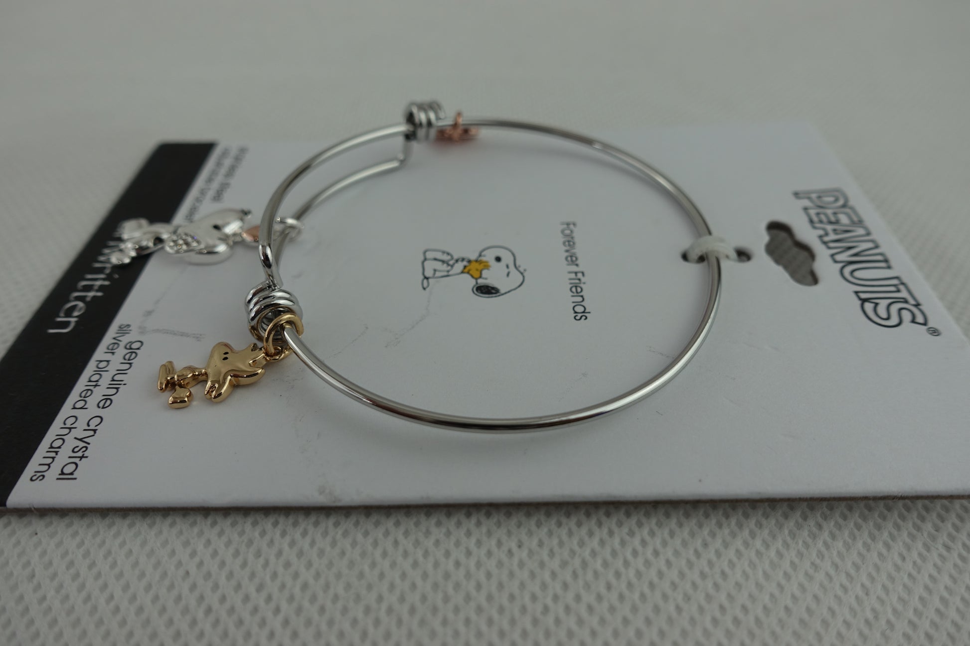 Modelo: Snoopy & Woodstock Bangle Bracelet in Tri-Tone Stainless Steel with Silver Plated Charms